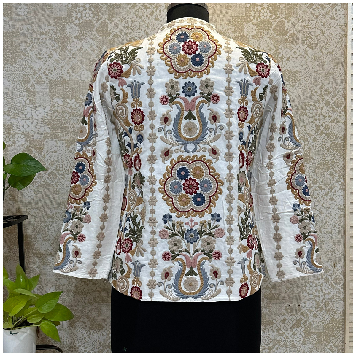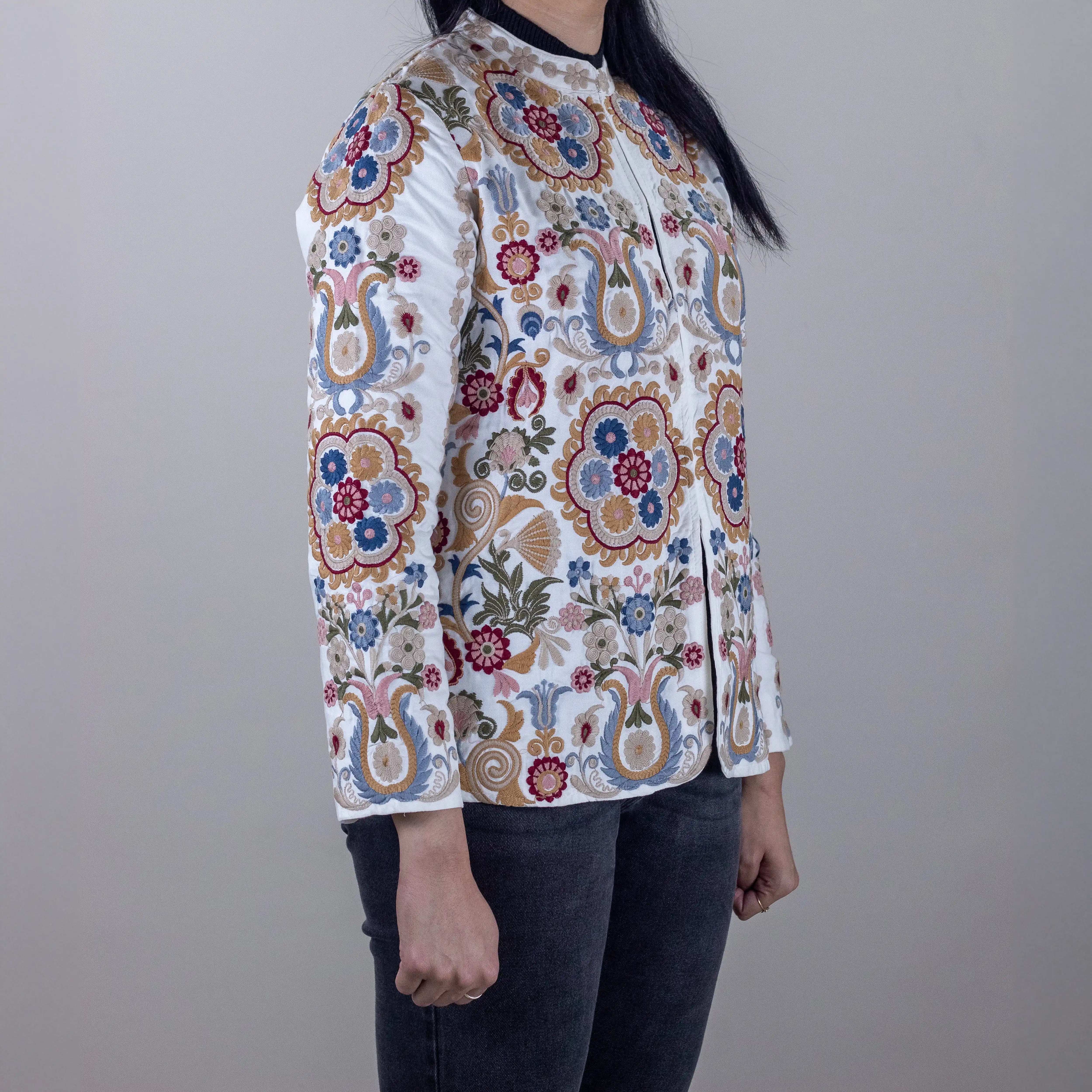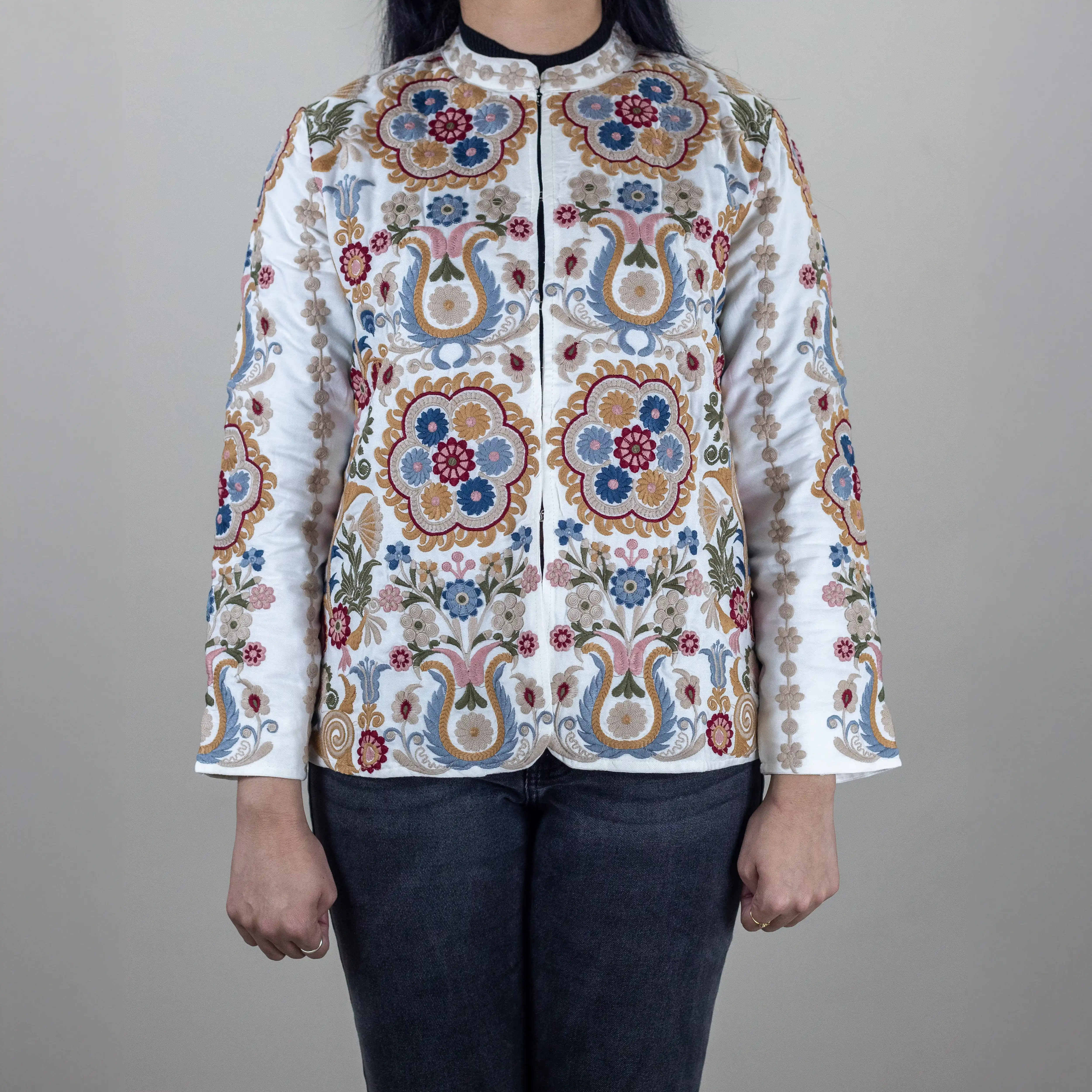 Stay stylish this season in CIELLE's white Embroidered Short Jacket. Crafted of soft cotton and viscose, this stunning jacket features unique embroidery that adds a touch of elegance to any ensemble. Keep warm and cozy in this must-have style.