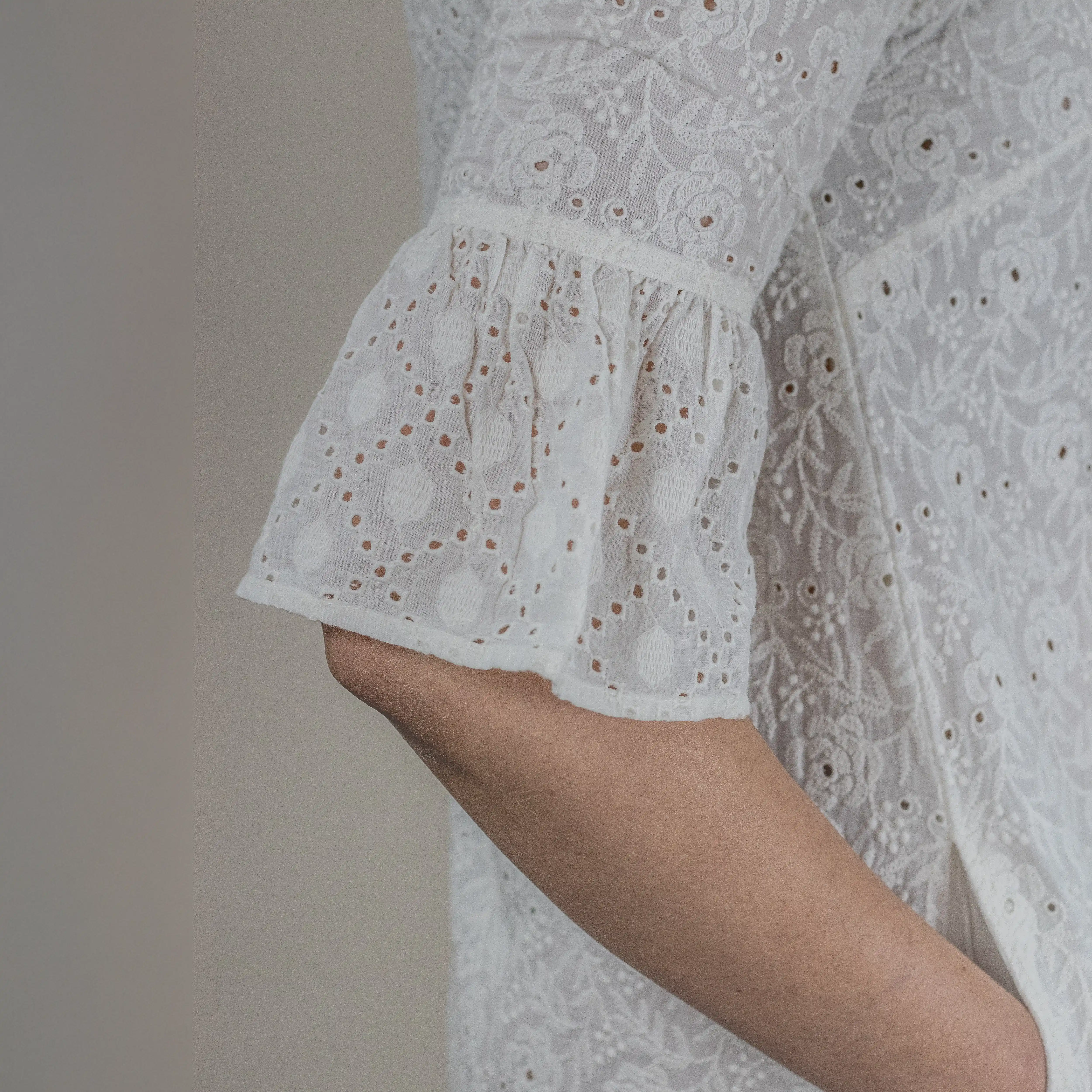 Cielle’s ‘Irish’ dress is detailed with ornate embroidery adding to its feminine appearance. Cut from lightweight cotton, it has ruffled cuffs and pockets which makes it a perfect slipping on outfit.