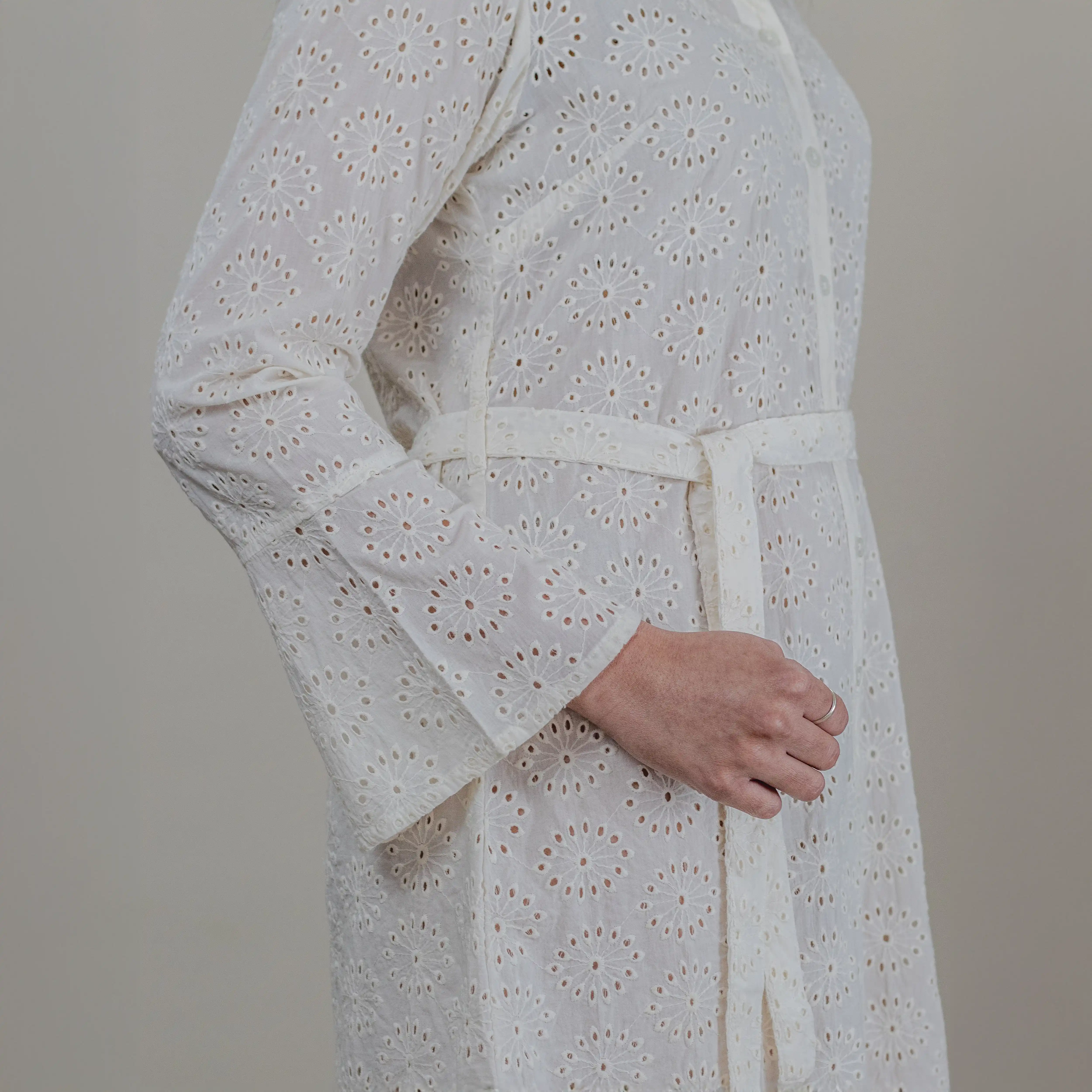 Cielle’s ‘poppy’ dress is detailed with ornate embroidery adding to its whimsical feel. Cut from lightweight chikankari cotton, it has flared sleeves and optional belt.