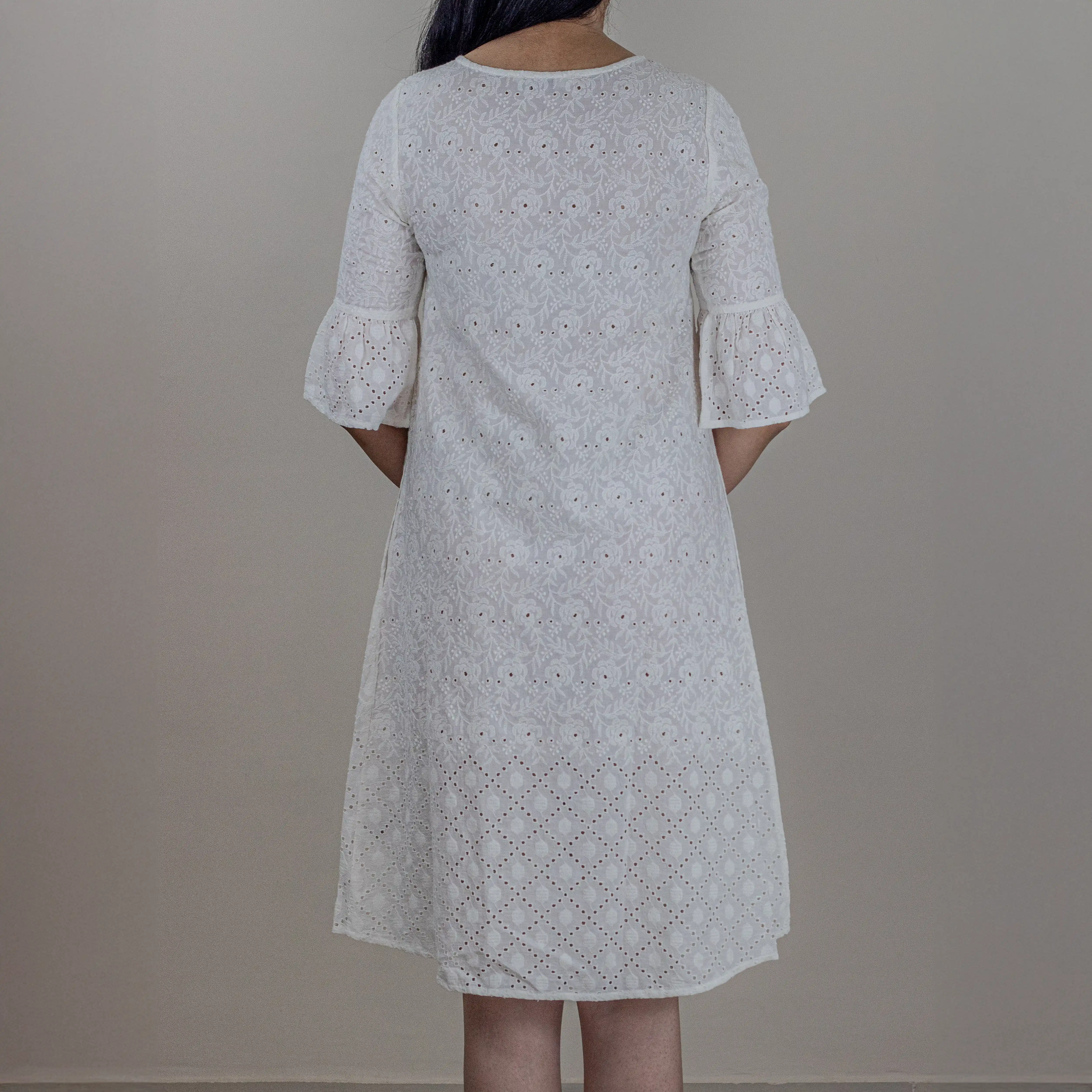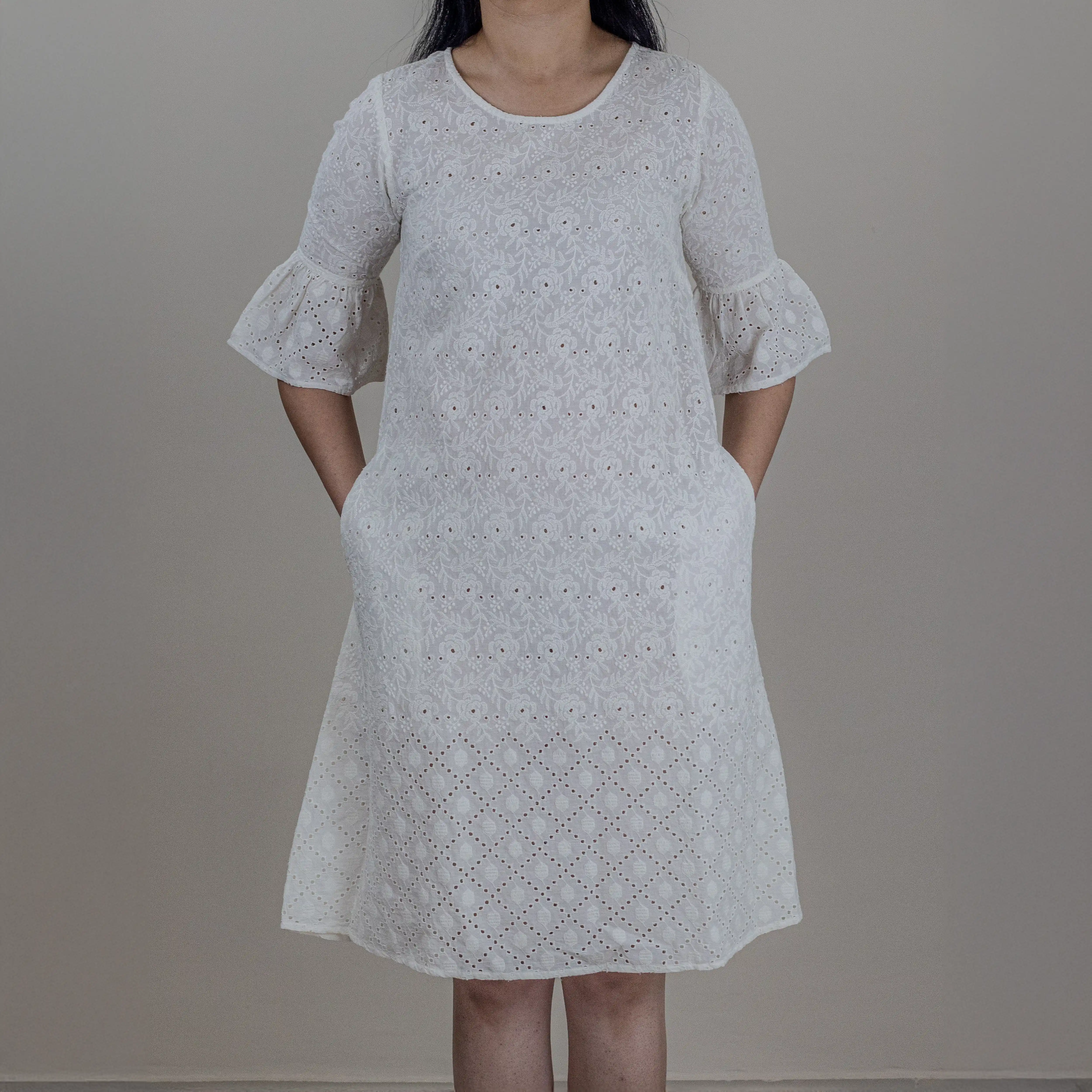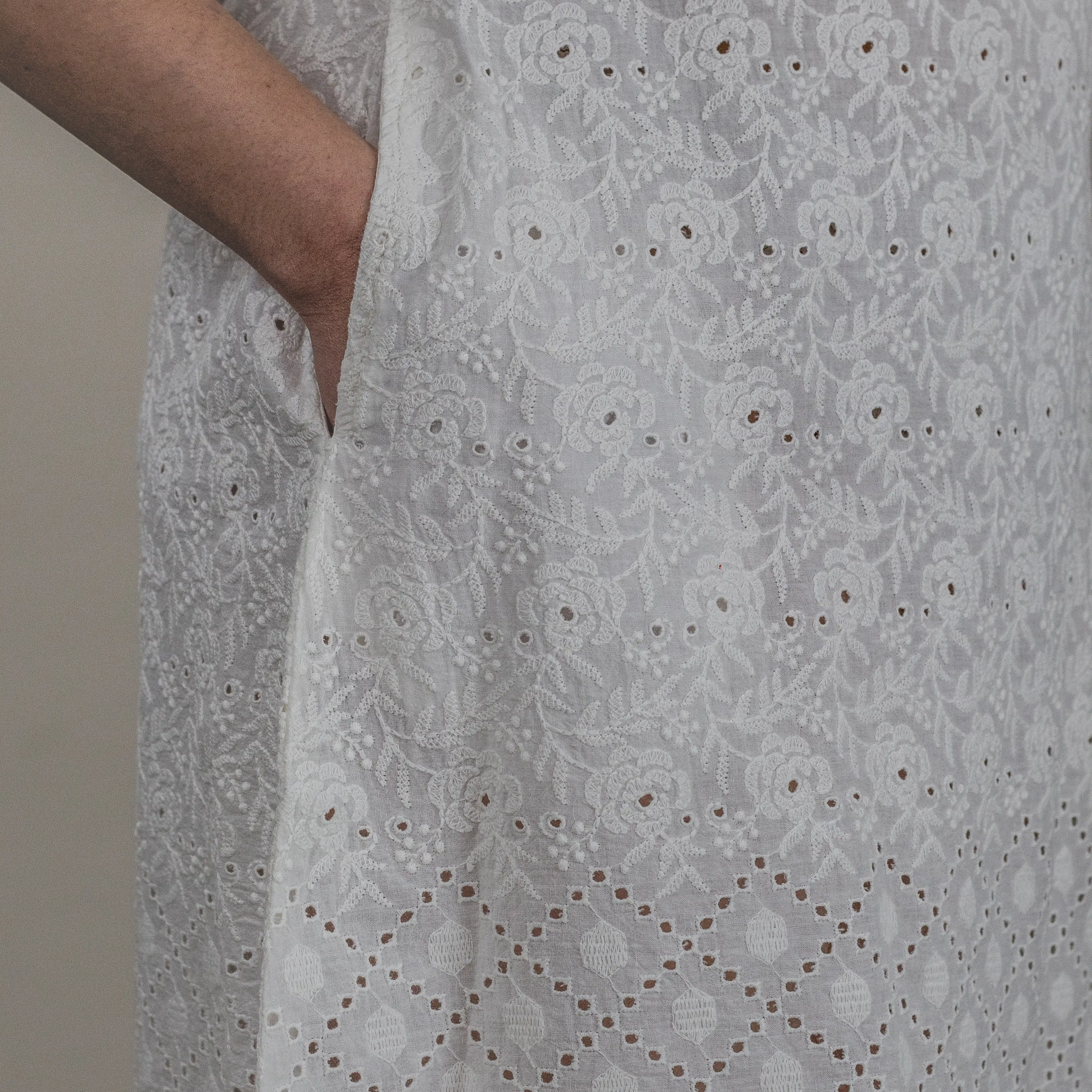 Cielle’s ‘Irish’ dress is detailed with ornate embroidery adding to its feminine appearance. Cut from lightweight cotton, it has ruffled cuffs and pockets which makes it a perfect slipping on outfit.