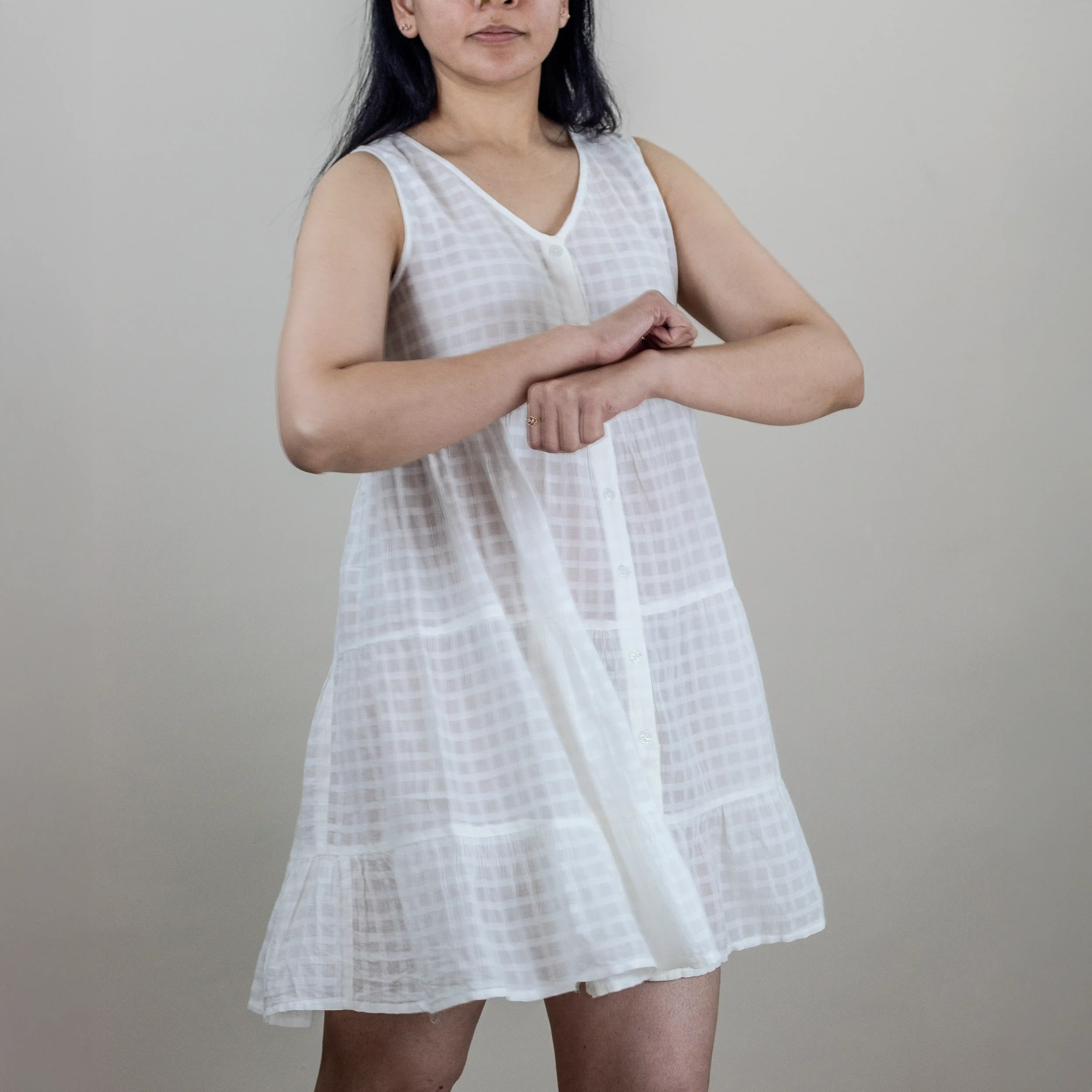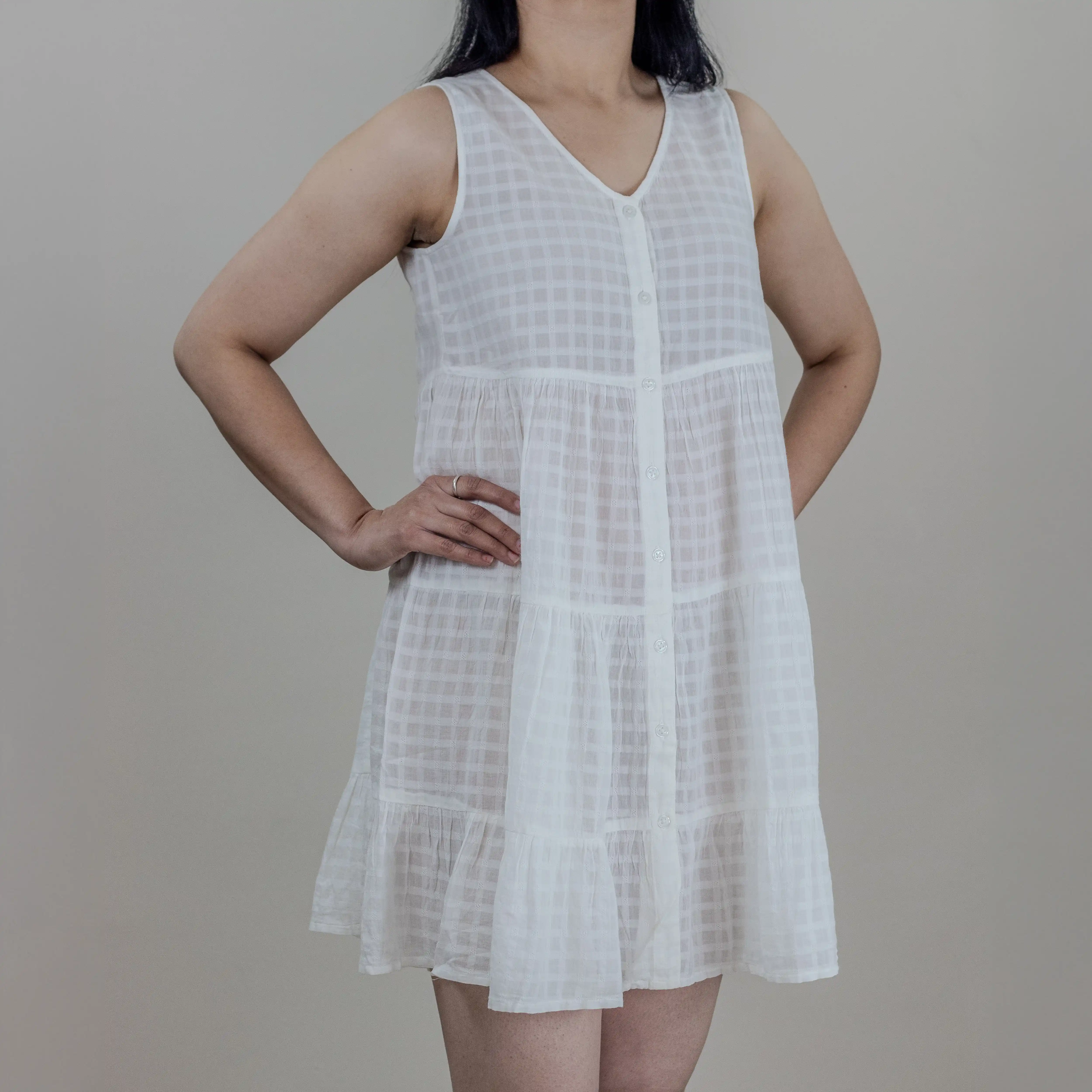 This swirly dress is the sleeveless version of Cielle’s ‘Lilac’ short dress. Cut from lightweight and airy sheer cotton, this V-neckline, multi tiered hem dress has button fastenings through front.